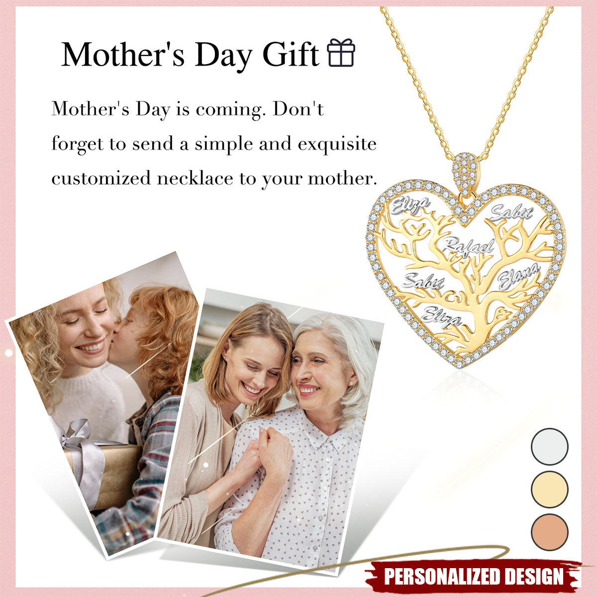 Express your love and affection with this elegant heart-shaped necklace featuring the Tree of Life, a timeless symbol of connection and growth. Crafted with exquisite detail, each pendant is adorned with sparkling rhinestones and can be personalized with the name of your choice to make it unique and meaningful. Ideal as a sentimental gift, this timeless piece of jewelry suits any occasion and style.