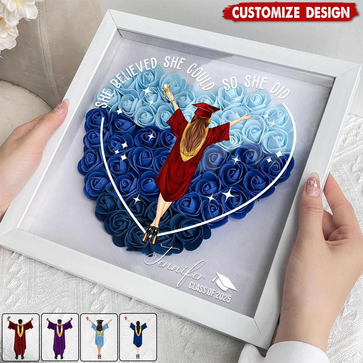 The Personalized Flower Shadow Box for Graduation serves as a constant reminder of the hard work and dedication that the graduate has put into achieving their goals. It is the perfect way to commemorate this significant moment in their life, bringing comfort and joy to their everyday wear.